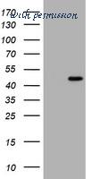 HEK293T cells were transfected with the pCMV6-ENTRY control (Left lane) or pCMV6-ENTRY CDC123 (Right lane) cDNA for 48 hrs and lysed. Equivalent amounts of cell lysates (5 ug per lane) were separated by SDS-PAGE and immunoblotted with anti-CDC123.