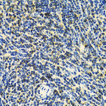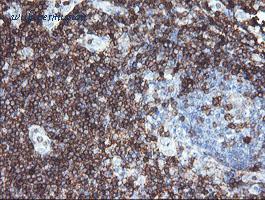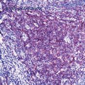 Immunohistochemistry of paraffin-embedded rat spleen using CD3E antibodyat dilution of 1:100 (40x lens).