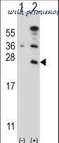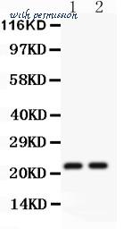 CD3 epsilon antibody Western blot. All lanes: Anti CD3 Epsilon at 0.5 ug/ml. Lane 1: JURKAT Whole Cell Lysate at 40 ug. Lane 2: CEM Whole Cell Lysate at 40 ug. Predicted band size: 23 kD. Observed band size: 23 kD.
