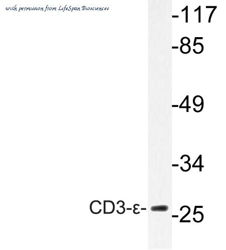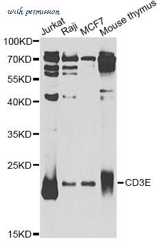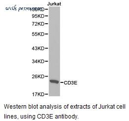 Western blot analysis of extracts of various cell lines, using CD3E antibody at 1:1000 dilution. The secondary antibody used was an HRP Goat Anti-Rabbit IgG (H+L) at 1:10000 dilution. Lysates were loaded 25ug per lane and 3% nonfat dry milk in TBST was used for blocking. An ECL Kit was used for detection and the exposure time was 5s.