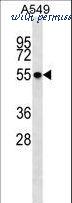 STK17B Antibody western blot of A549 cell line lysates (35 ug/lane). The STK17B antibody detected the STK17B protein (arrow).
