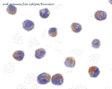 Immunocytochemistry of DRAK2 in Jurkat cells with DRAK2 antibody at 10 ug/ml.