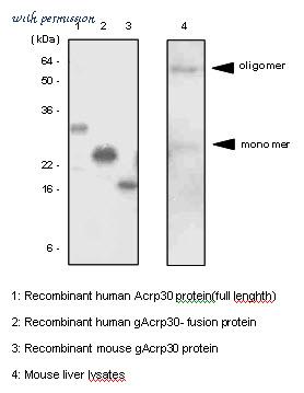 The recombinant proteins and mouse liver lysates were resolved by SDS-PAGE, transferred to PVDF membrane and probed with anti-human adiponectin antibody (1:500). Proteins were visualized using a goat anti-mouse secondary antibody conjugated to HRP and an ECL detection system. Arrows indicate the oligomer and monomer of mAcrp30 protein in mouse liver.
