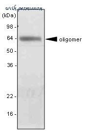 The extract of mouse liver was resolved by SDS-PAGE, transferred to PVDF membrane and probed with anti-human adiponectin antibody (1:2000). Proteins were visualized using a goat anti-mouse secondary antibody conjugated to HRP and an ECL detection system. Arrow indicates the oligomer of mouse adiponectin protein in mouse liver.