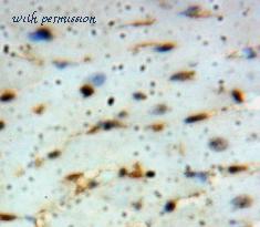 Immunohistochemistry of adiponectin in rat brain tissue with adiponectin antibody at 1 ug/ml.