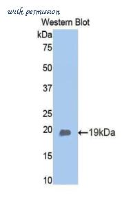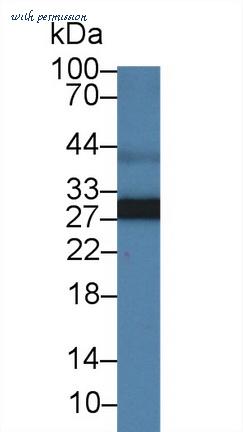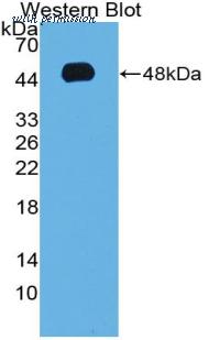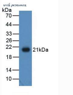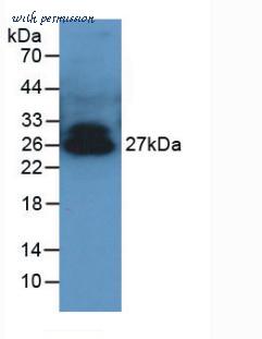 Western Blot; Sample: Canine Skeletal muscle lysate; Primary Ab: 2µg/ml Rabbit Anti-Canine ADP Antibody Second Ab: 0.2µg/mL HRP-Linked Caprine Anti-Rabbit IgG Polyclonal Antibody