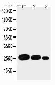 Western blot of adiponectin in rat brain cell lysate with adiponectin antibody at (A) 1, (B) 2, and (C) 4 ug/ml.