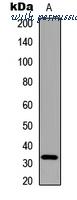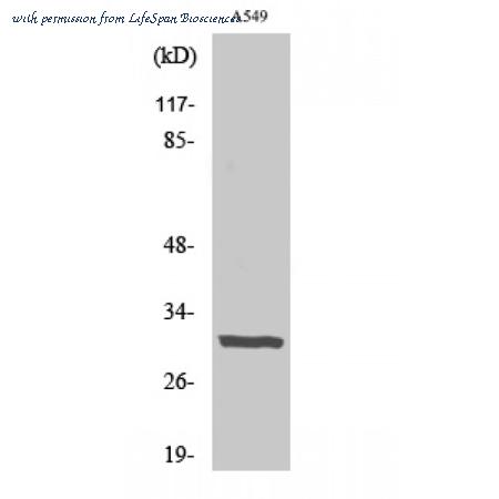 Western blot analysis of Adiponectin expression in A549 (A) whole cell lysates.