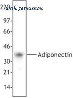 Recombinant human adiponectin (1 ug/lane) was resolved by SDS-PAGE electrophoresis, transferred to nitrocellulose, and probed with rabbit anti-adiponectin antibody. The protein was visualized using a donkey anti-rabbit secondary conjugated to HRP and a.