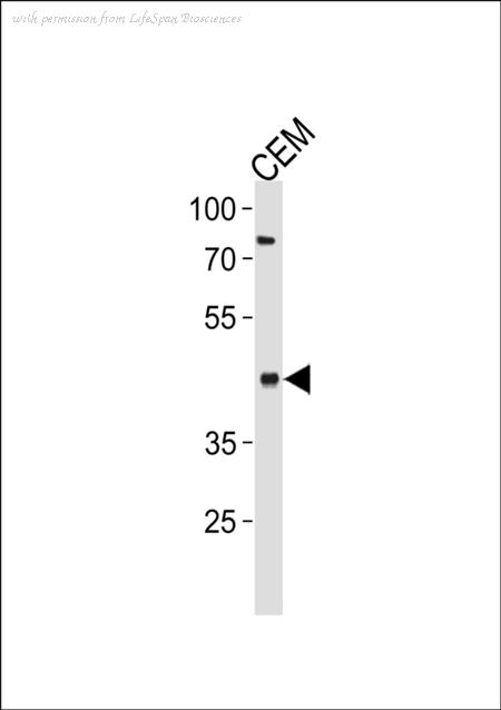 FADS2 Antibody western blot of CEM cell line lysates (35 ug/lane). The FADS2 antibody detected the FADS2 protein (arrow).