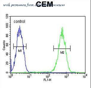 FADS2 Antibody flow cytometry of CEM cells (right histogram) compared to a negative control cell (left histogram). FITC-conjugated goat-anti-rabbit secondary antibodies were used for the analysis.