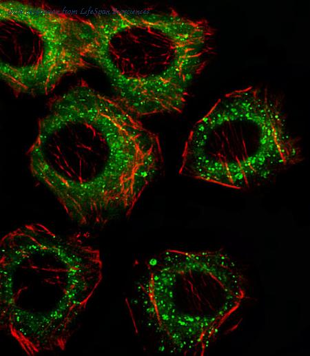 Fluorescent image of A549 cell stained with FADS2 Antibody. A549 cells were fixed with 4% PFA (20 min), permeabilized with Triton X-100 (0.1%, 10 min), then incubated with FADS2 primary antibody (1:25, 1 h at 37°C). For secondary antibody, Alexa Fluor 488 conjugated donkey anti-rabbit antibody (green) was used (1:400, 50 min at 37°C). Cytoplasmic actin was counterstained with Alexa Fluor 555 (red) conjugated Phalloidin (7units/ml, 1 h at 37°C). FADS2 immunoreactivity is localized to Cytoplasm and Vesicles significantly.