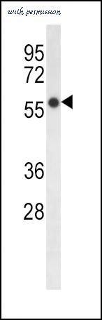 FADS2 Antibody western blot of HepG2 cell line lysates (35 ug/lane). The FADS2 antibody detected the FADS2 protein (arrow).