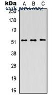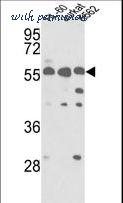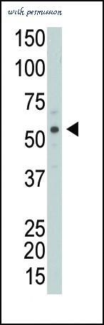 Western blot of hPRKCABP-C300 in HL-60, Jurkat, K562 cell line lysates (35 ug/lane). PRKCABP (arrow) was detected using the purified antibody.