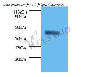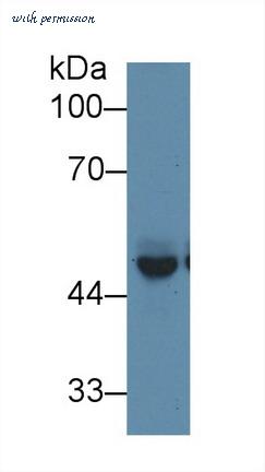 Western Blot; Sample: Mouse Cerebrum lysate; Primary Ab: 1µg/ml Rabbit Anti-Mouse PICK1 Antibody Second Ab: 0.2µg/mL HRP-Linked Caprine Anti-Rabbit IgG Polyclonal Antibody