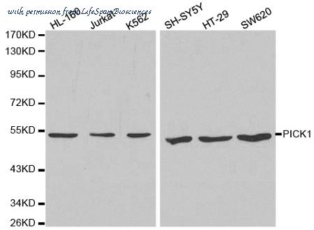 Western blot analysis of extracts of various cell lines, using PICK1 antibody at 1:1000 dilution. The secondary antibody used was an HRP Goat Anti-Rabbit IgG (H+L) at 1:10000 dilution. Lysates were loaded 25ug per lane and 3% nonfat dry milk in TBST was used for blocking.