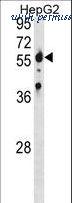 SPTLC2 Antibody western blot of HepG2 cell line lysates (35 ug/lane). The SPTLC2 antibody detected the SPTLC2 protein (arrow).