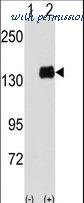 Western blot of PUM1 (arrow) using PUM1 Antibody (Y83). 293 cell lysates (2 ug/lane) either nontransfected (Lane 1) or transiently transfected with the PUM1 gene (Lane 2) (Origene Technologies).