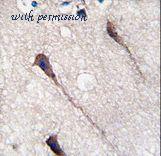 Formalin-fixed and paraffin-embedded human brain tissue reacted with Phospho-PUM1-Y83.control antibody, which was peroxidase-conjugated to the secondary antibody, followed by DAB staining. This data demonstrates the use of this antibody for immunohistochemistry; clinical relevance has not been evaluated.