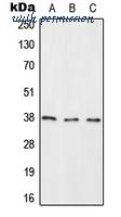 Western blot analysis of RASSF2 expression in HeLa (A); NIH3T3 (B); H9C2 (C) whole cell lysates.