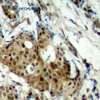 Immunohistochemical analysis of CDK11B staining in human breast cancer formalin fixed paraffin embedded tissue section. The section was pre-treated using heat mediated antigen retrieval with sodium citrate buffer (pH 6.0). The section was then incubated with the antibody at room temperature and detected with HRP and DAB as chromogen. The section was then counterstained with hematoxylin and mounted with DPX.