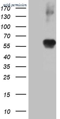 HEK293T cells were transfected with the pCMV6-ENTRY control (Cat# PS100001, Left lane) or pCMV6-ENTRY RING1 (Cat# RC202650, Right lane) cDNA for 48 hrs and lysed. Equivalent amounts of cell lysates (5 ug per lane) were separated by SDS-PAGE and immunoblotted with anti-RING1 (Cat# TA809319)(1:2000). Positive lysates [LY401023] (100ug) and [LC401023] (20ug) can be purchased separately from OriGene.