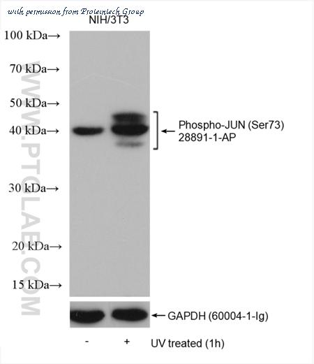The Phospho-JUN (Ser73) antibody from Proteintech is a rabbit polyclonal antibody to a peptide of human Phospho-JUN (Ser73). This antibody recognizes human, mouse, rat antigen. The Phospho-JUN (Ser73) antibody has been validated for the following applications: WB, ELISA analysis.