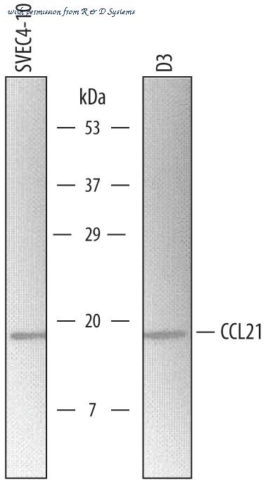 Detection of Mouse CCL21/6Ckine by Western Blot. Western blot shows lysates of SVEC4-10 mouse vascular endothelial cell line and D3 mouse embryonic stem cell line. PVDF membrane was probed with 2 ╡g/mL of Rat Anti-Mouse CCL21/6Ckine Monoclonal Antibody (Catalog # MAB4571) followed by HRP-conjugated Anti-Rat IgG Secondary Antibody (Catalog # HAF005 ). A specific band was detected for CCL21/6Ckine at approximately 15 kDa (as indicated). This experiment was conducted under reducing conditions and using Immunoblot Buffer Group 8 .