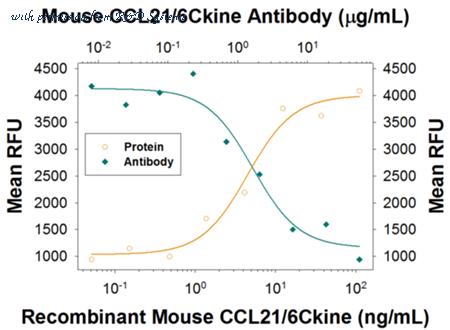 Chemotaxis Induced by CCL21/6Ckine and Neutralization by Mouse CCL21/6Ckine Antibody. Recombinant Mouse CCL21/6Ckine (Catalog # 457-6C ) chemoattracts the BaF3 mouse pro-B cell line transfected with human CCR7 in a dose-dependent manner (orange line). The amount of cells that migrated through to the lower chemotaxis chamber was measured by Resazurin (Catalog # AR002 ). Chemotaxis elicited by Recombinant Mouse CCL21/6Ckine (50 ng/mL) is neutralized (green line) by increasing concentrations of Goat Anti-Mouse CCL21/6Ckine Antigen Affinity-purified Polyclonal Antibody (Catalog # AF457). The ND50 is typically 0.5-2.5 ╡g/mL.
