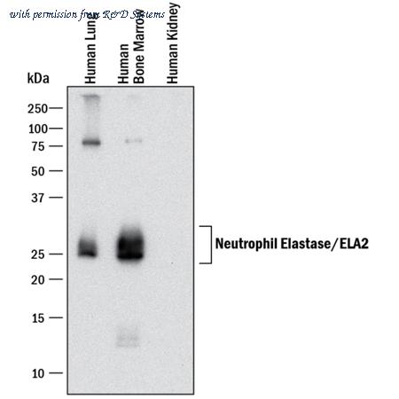 Detection of Human Neutrophil Elastase/ELA2 antibody by Western Blot.
