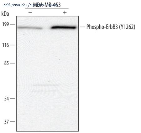 Detection of Human Phospho-ErbB3/Her3 (Y1262) antibody by Western Blot.