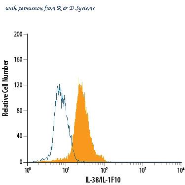 Detection of Rat IgG Primary Antibody by Flow Cytometry RAW 264.7 mouse monocyte/macrophage cell line was stained with Rat Anti-Mouse IL-38/IL-1F10 Monoclonal Antibody (Catalog # MAB7774, filled histogram) or isotype control antibody (open histogram), followed by Fluorescein-conjugated Anti-Rat IgG Secondary Antibody (Catalog # F0104B) at 10 uL/106 cells. To facilitate intracellular staining, cells were fixed with paraformaldehyde and permeabilized with saponin.