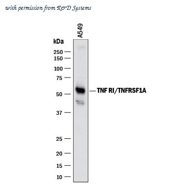 Detection of Mouse TNF RI/TNFRSF1A by Western Blot. Western blot shows lysates of L-929 mouse fibroblast cell line. PVDF membrane was probed with 0.2 ╡g/mL of Goat Anti-Mouse TNF RI/TNFRSF1A Antigen Affinity-purified Polyclonal Antibody (Catalog # AF-425-PB) followed by HRP-conjugated Anti-Goat IgG Secondary Antibody (Catalog # HAF109 ). A specific band was detected for TNF RI/TNFRSF1A at approximately 50-55 kDa (as indicated). This experiment was conducted under reducing conditions and using Immunoblot Buffer Group 1 .