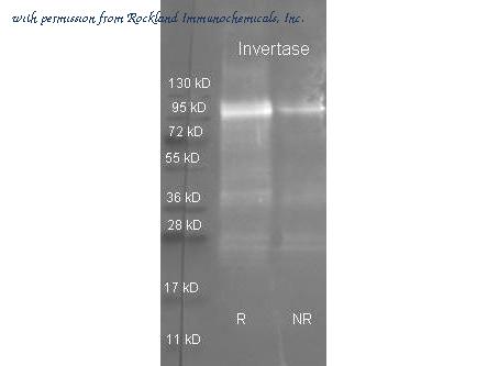 Rockland Goat anti Invertase antibody (100-101-189 lot 6736) was used to detect purified invertase under reducing (R) and non-reducing (NR) conditions. Reduced samples of purified target protein contained 4% BME and were boiled for 5 minutes. Samples of ~1ug of protein per lane were run by SDS-PAGE. Protein was transferred to nitrocellulose and probed with 1:3000 dilution of primary antibody (ON 4 C in MB-070). Detection shown was using Dylight 488 conjugated Donkey anti goat (605-741-125 lot 21094 1:10K in TBS/MB-070 1 hr RT) . Images were collected using the BioRad VersaDoc System