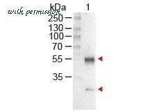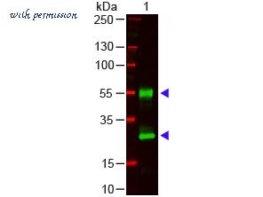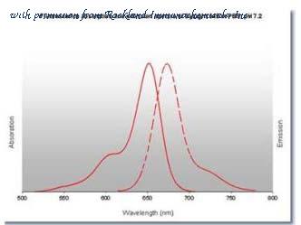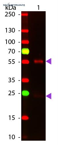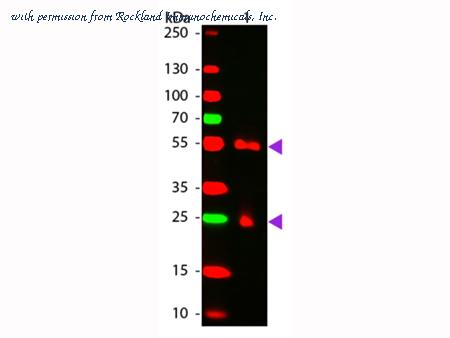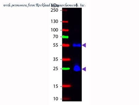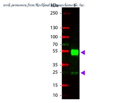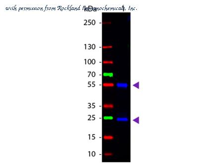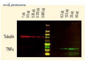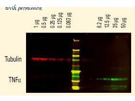 DyLight™ dyes can be used for two-color Western Blot detection with low background and high signal. Anti-tubulin was detected using a DyLight™ 680 conjugate. Anti-TNFa was detected using a DyLight™ 800 conjugate. The image was captured using the Odyssey® Infrared Imaging System developed by LI-COR.
