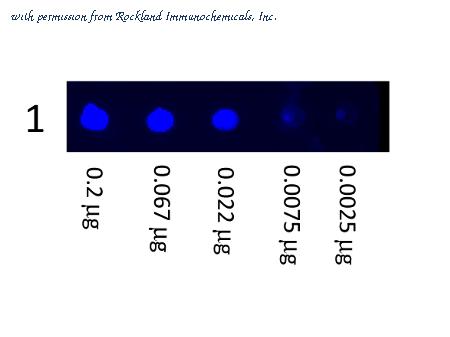 Western Blot of Donkey anti-Mouse IgG Pre-Absorbed Fluorescein Conjugated Secondary Antibody. Lane 1: Mouse IgG. Lane 2: None. Load: 50 ng per lane. Primary antibody: None. Secondary antibody: Fluorescein donkey secondary antibody at 1:1,000 for 60 min at RT. Block: MB-070 for 30 min at RT. Predicted/Observed size: 25 & 55 kDa, 25 & 55 kDa for Mouse IgG. Other band(s): None.
