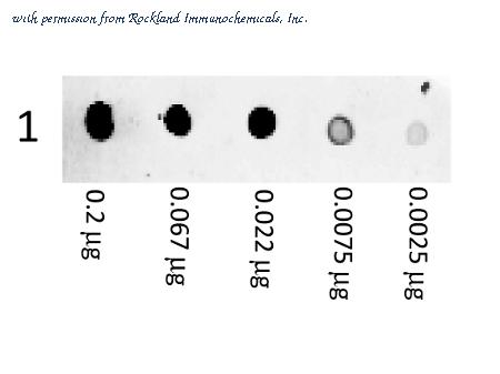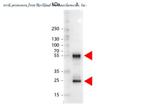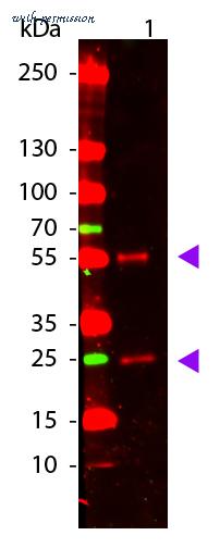 Western blot of Peroxidase conjugated Chicken Anti-Mouse IgG secondary antibody. Lane 1: Mouse IgG. Lane 2: None. Load: 50 ng per lane. Primary antibody: None. Secondary antibody: Peroxidase chicken secondary antibody at 1:1,000 for 60 min at RT. Blocking: MB-070 for 30 min at RT. Predicted/Observed size: 25 & 55 kDa, 25 & 55 kDa for Mouse IgG. Other band(s): None.