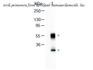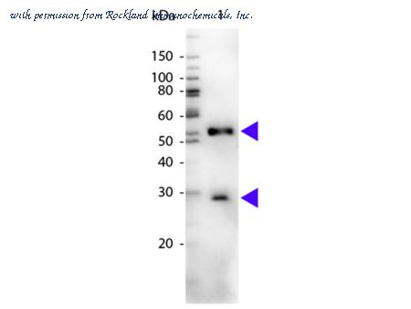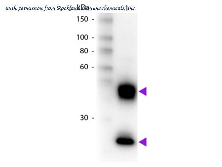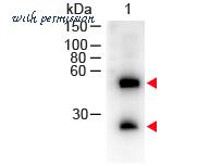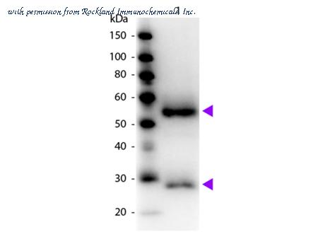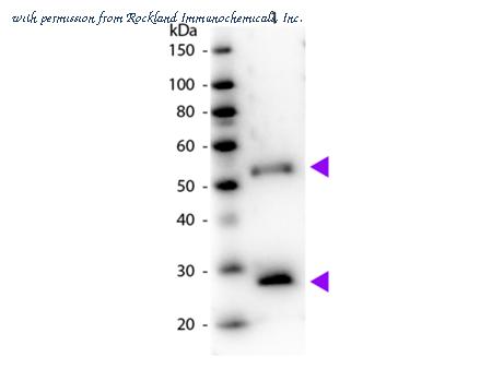 Western Blot of Rabbit anti-Mouse IgG Antibody Alkaline Phosphatase Conjugated Lane 1: Mouse IgG Load: 100 ng per lane Secondary antibody: MOUSE IgG (H&L) Antibody Alkaline Phosphatase Conjugated at 1:1,000 for 60 min at RT Block: MB-070 for 30 min at RT Predicted/Observed size: 55 and 28 kDa, 55 and 28 kDa
