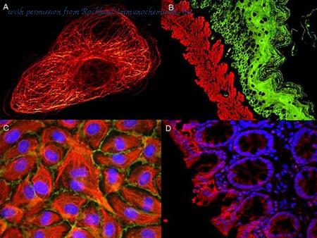 DyLight™ dyes can be used for multi-color immunofluorescence microscopy with uniform fluorescence intensity throughout the image. DyLight™ dyes are exceptionally bright and photostable and are optimized for microscopy and microarray detection methods. This image shows anti-Histone detection using a DyLight™ 488 conjugate (green). Anti-Tubulin was detected using a DyLight™ 549 conjugate (red). Nuclei were counter-stained using DAPI (blue). The image was captured using an Axio Imager.Z1 (Zeiss Micro Imaging Inc).