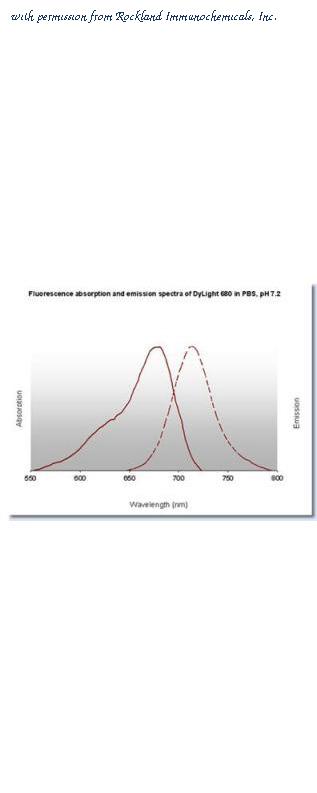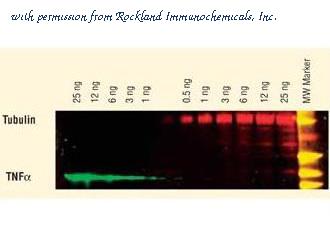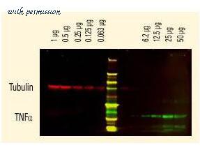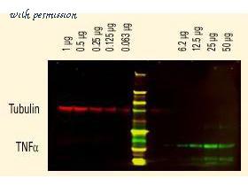 DyLight™ dyes can be used for two-color western blot detection with low background and high signal. Anti-tubulin was detected using a DyLight™ 680 conjugate. Anti-TNF? was detected using a DyLight™ 800 conjugate. The image was captured using the Odyssey® Infrared Imaging System developed by LI-COR.