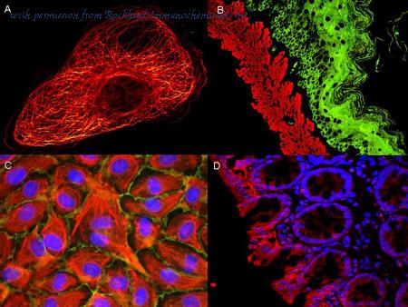 ATTO ® dyes can be used for multicolor immunofluorescent detection with low background and high signal. Examples shown are: A. Tubulin in PtK2- male Rat Kangaroo Kidney Epithelial Cells was detected using ATTO 532 labeled secondary antibody. B. Muscle alpha-actin was stained with a mouse primary antibody and ATTO 488 anti-mouse IgG (green) while Cytokeratin was stained with polyclonal rabbit anti-cytokeratin and ATTO 647N anti-rabbit IgG (red). C. HUVEC (Human umbilical vein endothelial cells were stained with anti- Vimentin-ATTO 532 (green), anti-E-Cadherin-ATTO 655 (red) and DAPI (blue). D. Rat colon sections were stained with Anti-Aquaporin 3-ATTO 594 antibody. Hoechst 33342 (blue) is used as counterstain. Images provided courtesy of Dr. Jörg Reichwein, ATTO-TEC GmbH