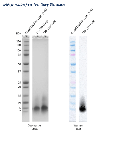 SDS-PAGE analysis of Human Synthetic Amyloid Beta Peptide 1-40 Monomers on a 4-12% Bis-Tris gel (left). Western Blot of Human Synthetic Amyloid Beta Peptide 1-40 Monomers using an anti-amyloid beta 1-16 monoclonal antibody [6E10] (Biolegend Cat # 803012) at 1:1000. Secondary antibody was a goat anti-mouse:HRP at 1:4000. Exposed 5 seconds (right).