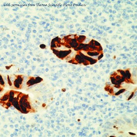 Formalin-fixed, paraffin-embedded human infected appendix stained with Adenovirus antibody using peroxidase-conjugate and DAB chromogen. Note nuclear and cytoplasmic staining of infected epithelial cells.