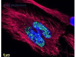 DyLight™ dyes can be used for multi-color immunofluorescence microscopy with uniform fluorescence intensity throughout the image. DyLight™ dyes are exceptionally bright and photostable and are optimized for microscopy and microarray detection methods. This image shows anti-histone detection using a DyLight™ 488 conjugate (green). Anti-Tubulin was detected using a DyLight™ 549 conjugate (red). Nuclei were counter-stained using DAPI (blue). The image was captured using an Axio Imager.Z1 (Zeiss Micro Imaging Inc).
