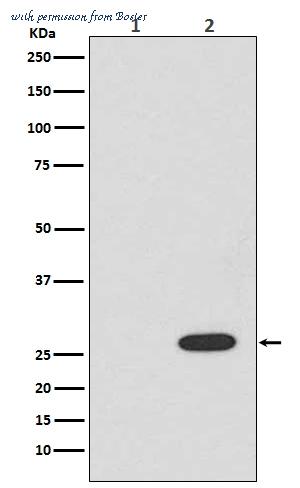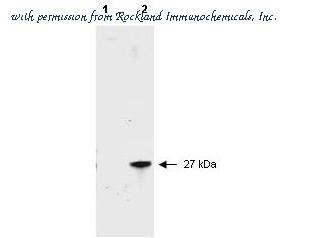 Western blot of RFP recombinant protein detected with Rockland's polyclonal anti-RFP antibody. Lane 1 shows no reaction against a GFP recombinant protein present in 10 ?g of HeLa cell extract. Lane 2 shows a single band detected in 10 ?g of a HeLa lysate containing RFP recombinant protein as a 27 kDa band. A 4-12% Bis-Tris gradient gel (Invitrogen) was used for SDS-PAGE. The membrane was blocked and then probed with Anti-RFP diluted 1:2,500 for 1 h at RT followed by washes and reaction with a 1:5,000 dilution of IRDye™800 conjugated Goat-a-Rabbit IgG [H&L] MX (611-132-122). IRDye™800 fluorescence image was captured using the Odyssey® Infrared Imaging System developed by LI-COR. IRDye is a trademark of LI-COR, Inc. Other detection systems will yield similar results.
