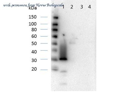 Western Blot: RFP Antibody [NBP1-69962] - Lane 1: RFP Lane 2: Human IgG Lane 3: Goat IgG Lane 4: Mouse IgG Load: 50ng per lane. Primary antibody: Pre-Absorbed at 1:1,000 overnight at 4C. Secondary antibody: Peroxidase conjugated rabbit secondary antibody at 1:40,000 for 30 min at RT. Block: MB-070 Blocking Buffer for 30 min at RT. Predicted/Observed size: 27 kDa, 30 kDa