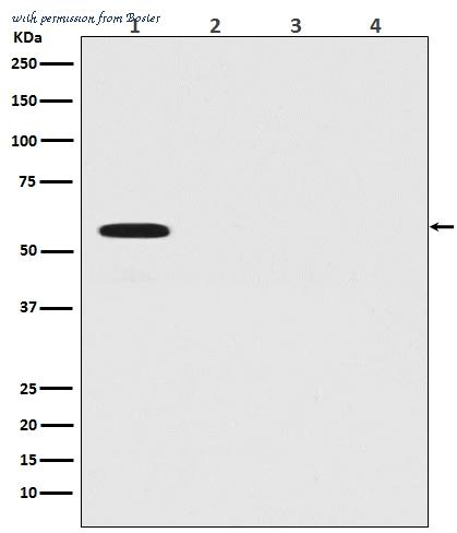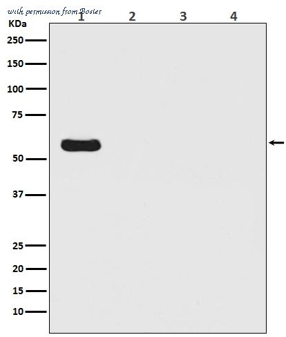 Western blot analysis of Firefly Luciferase Antibody expression in (1) Firefly Luciferase transfected 293T cell lysate; (2) HeLa cell lysate; (3) NIH/3T3 cell lysate; (4) C6 cell lysate (MT0021). Electrophoresis was performed on a 5-20% SDS-PAGE gel at 70V (Stacking gel) / 90V (Resolving gel) for 2-3 hours. The sample well of each lane was loaded with 50ug of sample under reducing conditions. After Electrophoresis, proteins were transferred to a Nitrocellulose membrane at 150mA for 50-90 minutes. Blocked the membrane with 5% Non-fat Milk/ TBS for 1.5 hour at RT. The membrane was incubated with rabbit anti-Firefly Luciferase monoclonal antibody (Catalog # MT0021) overnight at 4 , then washed with TBS-0.1%Tween 3 times with 5 minutes each and probed with a goat anti-rabbit IgG-HRP secondary antibody at a dilution of 1:10000 for 1.5 hour at RT. The signal is developed using an Enhanced Chemiluminescent detection (ECL) kit (Catalog # EK1002) with Tanon 5200 system. A specific band was detected for Firefly Luciferase