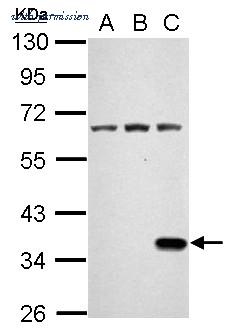 Western Blot analysis using anti-Renilla Luciferase Polyclonal Antibody on the following cells: (30 ug of whole cell lysate) A: 293T B: 293T transfected firefly C: 293T transfected Renilla Luciferase. Primary antibody (PA5-32210) diluted at 1:2000