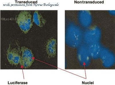 Immunohistochemistry: Luciferase Antibody (Luci 21 1-107) [NB600-307] - Detection of Luciferase expression in CD34+ cells by Immunohistochemistry. Cytospin slides prepared from transduced CD34+ cells after 3 days of culture were stained with monoclonal anti-Luciferase antibody. Luciferase-positive cells have green cytoplasm; nuclei stained with DAPI are blue. Nontransduced, cultured CD34+ cells were used as a negative control. Original magnification, x 40. Wang, X. et al., Dynamic tracking of human hematopoietic stem cell. Blood. 102(10): 3478-3482, 2003.
