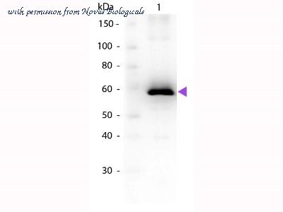 Western Blot: Luciferase Antibody [NB100-1677] - Lane 1: Luciferase, 50ng.Luciferase antibody at 1:1000 overnight at 4C. Secondary antibody: Peroxidase goat secondary antibody at 1:40,000 for 30 min at RT. Block: incubated with blocking buffer for 30 min at RT. Predicted/Observed size: 60 kDa for Luciferase. Other band(s): None.
